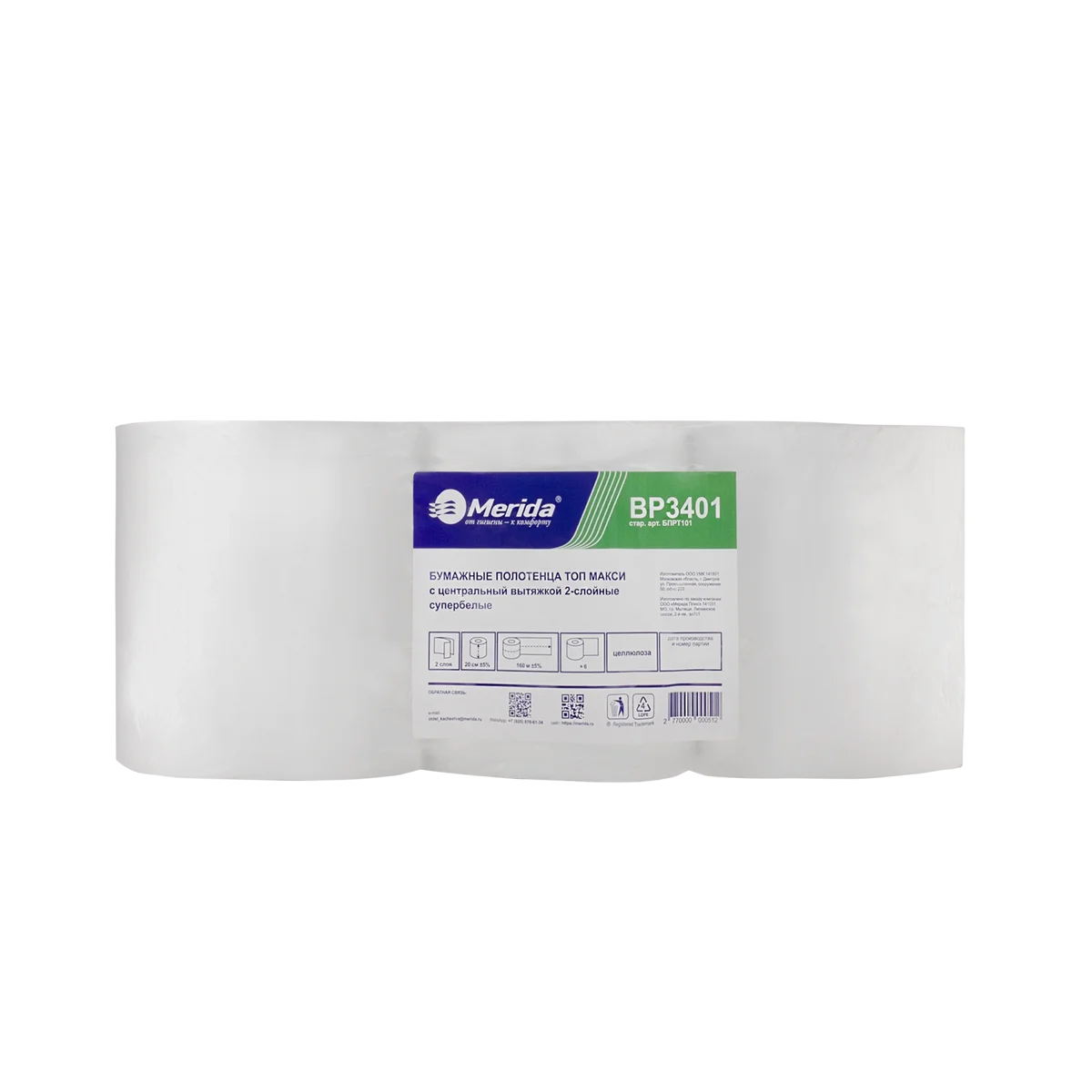 Бумажные полотенца Merida BP3401 в рулоне с центр. вытяжкой, Топ Макси, 2 слоя, белые, 160м, 6шт/уп
