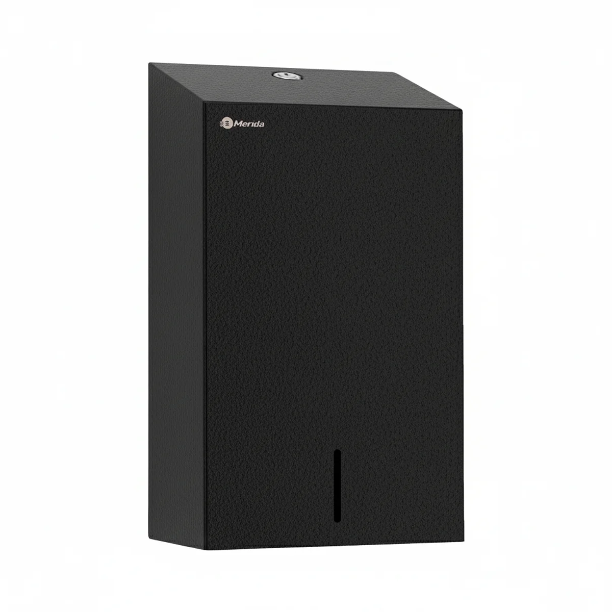 Диспенсер для бумажных полотенец V-сложения MERIDA STELLA R изготовлен из матовой нержавеющей стали AISI 304 толщиной 1 мм, что обеспечивает долговечность и стойкость к коррозии. Он оснащен прочным стальным барабанным замком, заподлицо с поверхностью устройства, и сварными соединениями боковых стенок, которые зашлифованы, образуя гладкую поверхность.