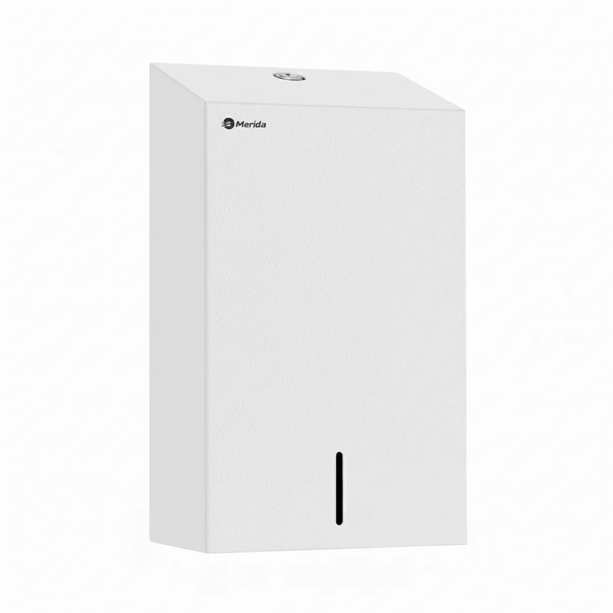 Диспенсер для бумажных полотенец V-сложения MERIDA STELLA R изготовлен из матовой нержавеющей стали AISI 304 толщиной 1 мм, что обеспечивает долговечность и стойкость к коррозии. Он оснащен прочным стальным барабанным замком, заподлицо с поверхностью устройства, и сварными соединениями боковых стенок, которые зашлифованы, образуя гладкую поверхность. Удобное окошко позволяет контролировать количество расходных материалов, а настенное крепление обеспечивает стабильность и надежность.