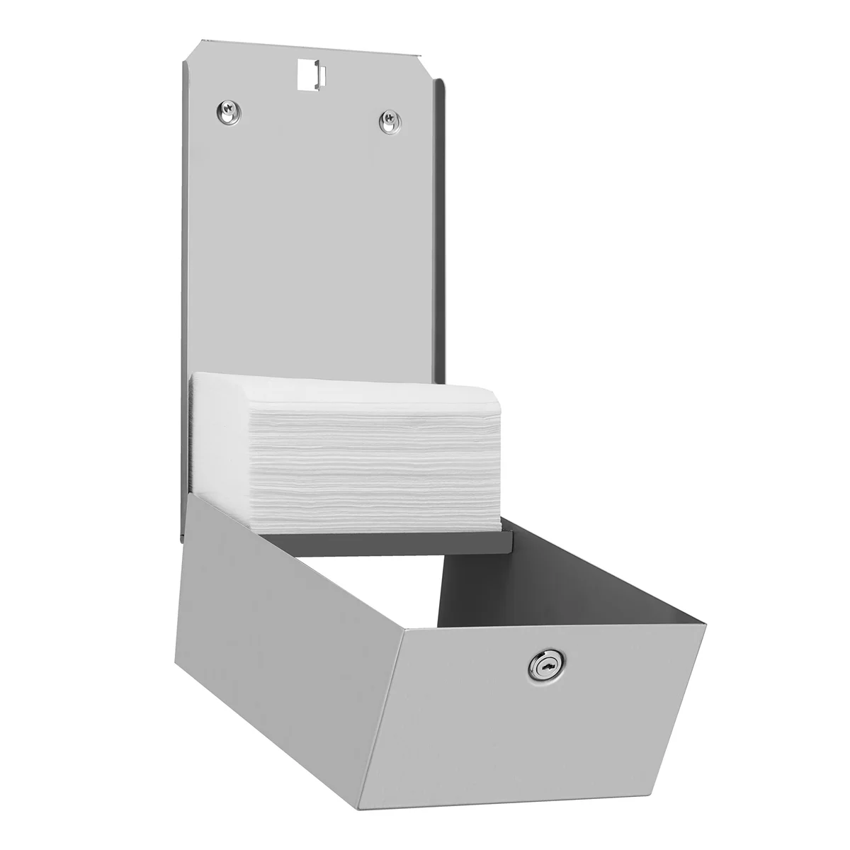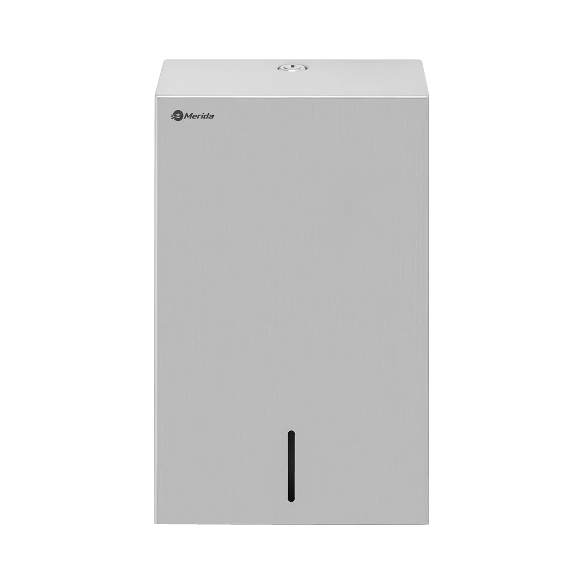 Диспенсер для бумажных полотенец V-сложения MERIDA STELLA R изготовлен из матовой нержавеющей стали AISI 304 толщиной 1 мм, что обеспечивает долговечность и стойкость к коррозии. Он оснащен прочным стальным барабанным замком, заподлицо с поверхностью устройства, и сварными соединениями боковых стенок, которые зашлифованы, образуя гладкую поверхность. Удобное окошко позволяет контролировать количество расходных материалов, а настенное крепление обеспечивает стабильность и надежность.