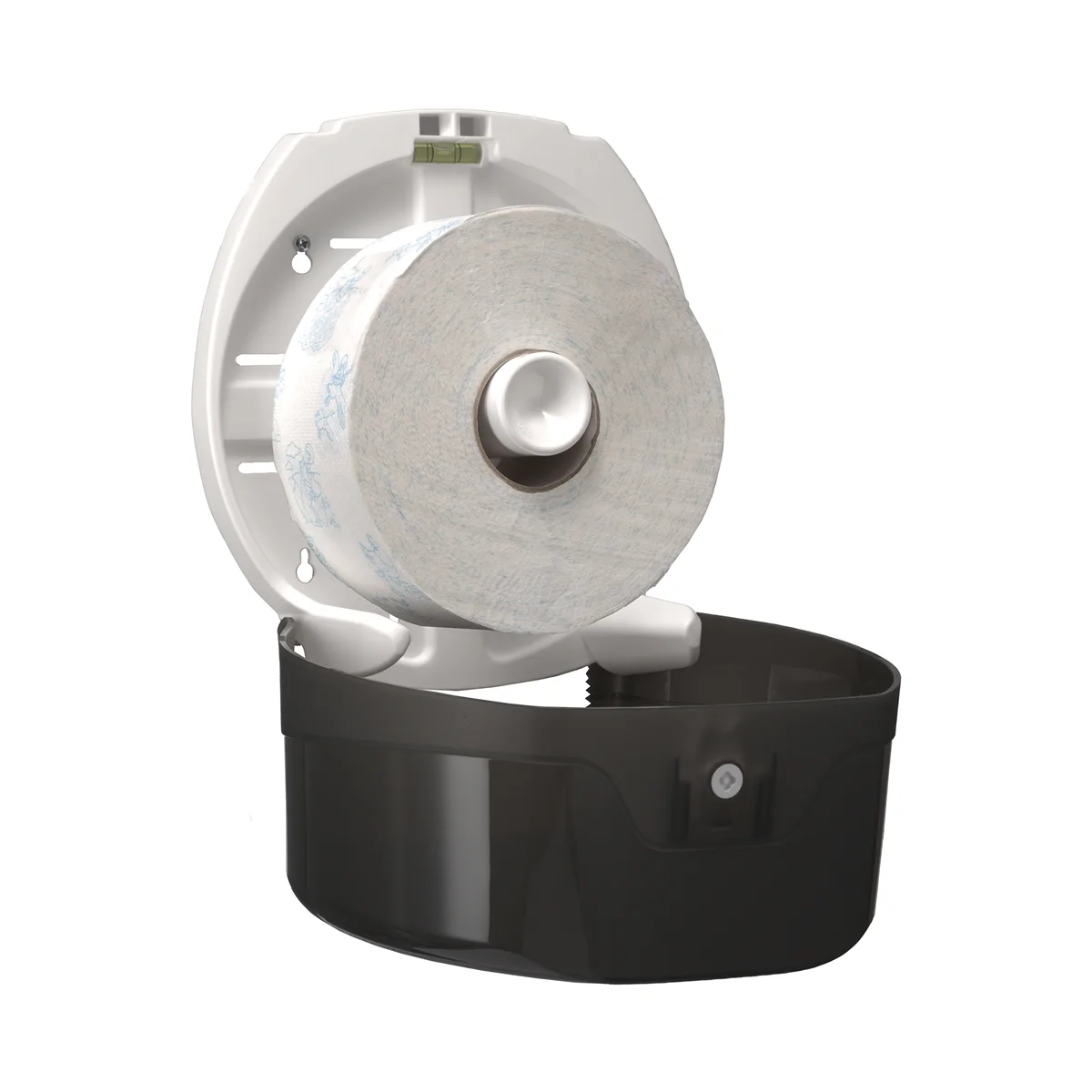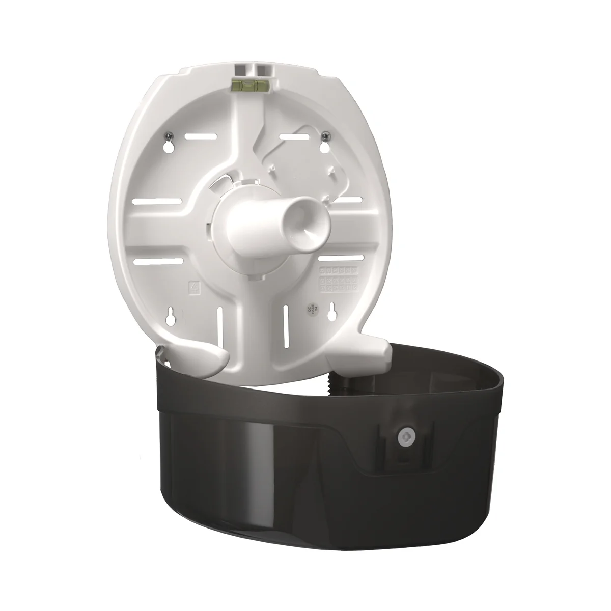 Диспенсер вмещает рулоны диаметром до 23 см, что позволяет быстро и удобно заменять расходный материал. Корпус выполнен из полупрозрачного пластика, что облегчает контроль за наличием бумаги и своевременную замену рулонов.