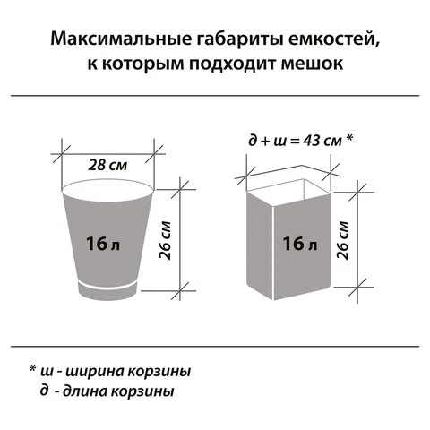 Изготовлены из полиэтилена низкого давления (ПНД) плотностью 8 микрон и имеют объем 20 литров. Размер мешка – 45х50 см (±5%). Поставляются в рулоне по 30 штук.