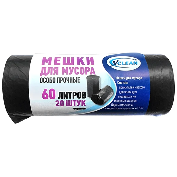 Мешки для мусора VCLEAN Professional особо прочные, объемом 60 литров, размером 60х70 см, черного цвета. Комплектация включает 20 штук, упакованных в рулон.