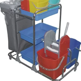 Мультифункциональная сервисная тележка, позволяет комплексно решить целый ряд вопросов в наведении чистоты – от уборки пыли и мытья полов до сортировки белья и подвоза необходимых материалов.