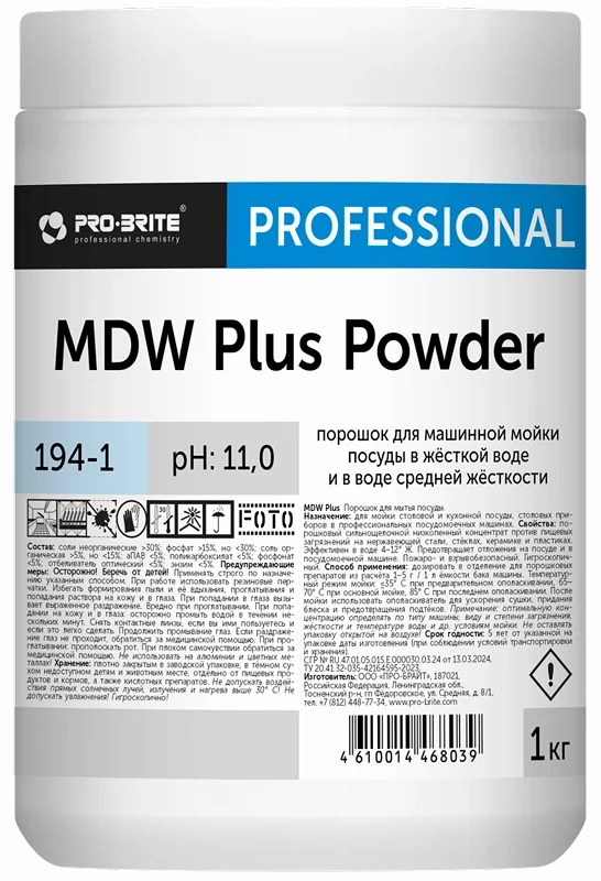 Порошковый сильнощелочной низкопенный концентрат против пищевых загрязнений на нержавеющей стали, стеклах, керамике и пластиках. Эффективен в воде с жесткостью 4–12° Ж. Предотвращает отложения на посуде и в посудомоечной машине. Пожаро- и взрывобезопасный, гигроскопичный.