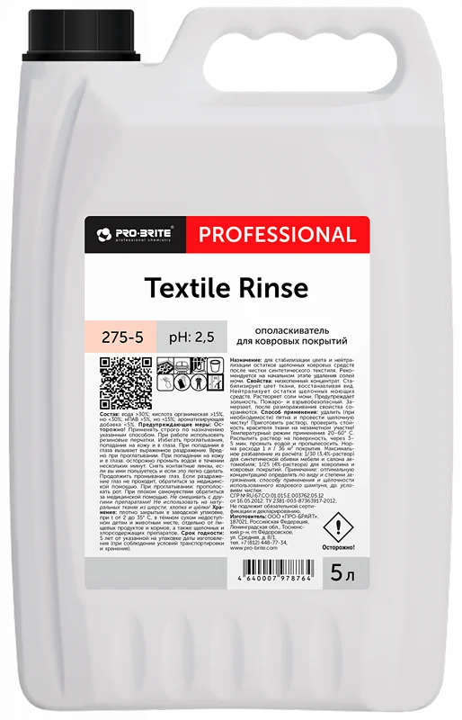 Жидкий кислотный низкопенный концентрат. Стабилизирует цвет ткани, восстанавливая вид. Нейтрализует остатки щелочных моющих средств. Растворяет соли мочи. Предупреждает зольность. Пожаро- и взрывобезопасный. Замерзает, после размораживания свойства сохраняются.