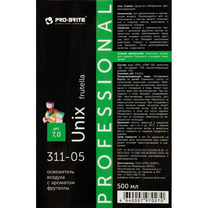 Жидкий нейтральный препарат с ароматом фрутеллы, готовый к применению. Обладает свойствами устранять неприятные запахи, связанные с приготовлением пищи, гниением пищевых остатков, мочой, рвотными массами и другими источниками. Обладает длительным действием. Пожаро- и взрывобезопасен. Замерзает при низких температурах, после размораживания свойства сохраняются.