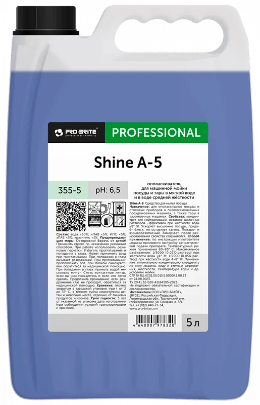 Жидкий нейтральный низкопенный концентрат для нейтрализации остатков щелочных растворов. Эффективен при жёсткости воды менее 8° Ж. Ускоряет высыхание посуды, придаёт блеск, не оставляет капли. Пожаро- и взрывобезопасный. Замерзает, после размораживания свойства сохраняются.