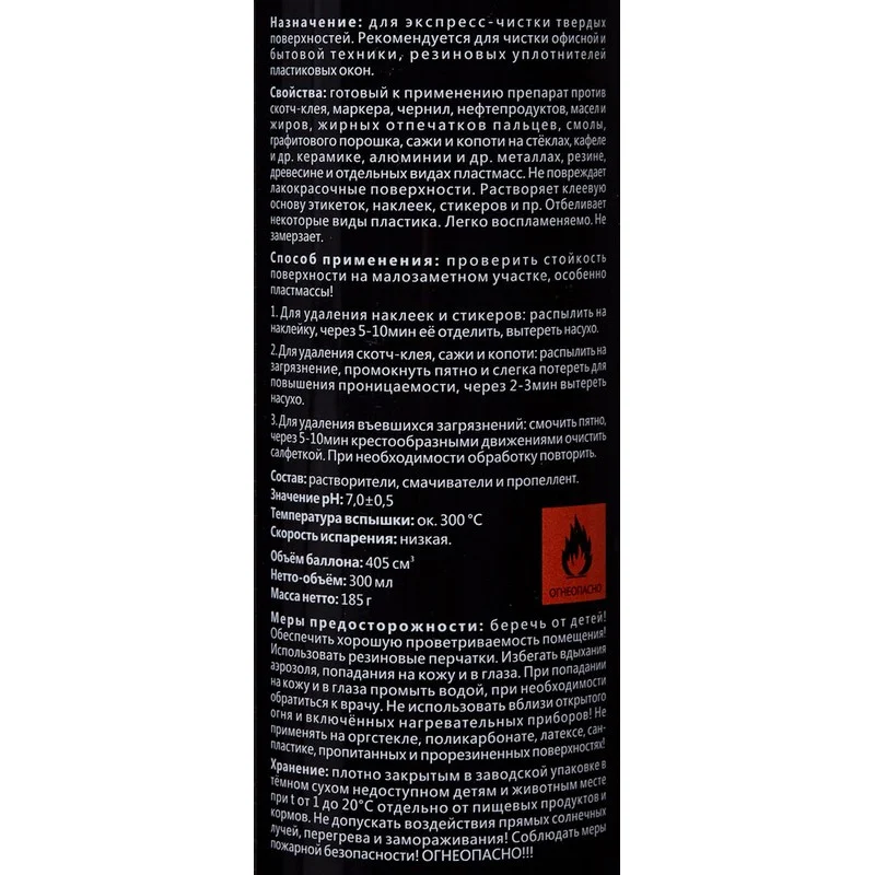 Аэрозольный препарат готов к применению, прозрачный, без цвета со специфическим запахом. Эффективен против скотч-клея, маркера, чернил, нефтепродуктов, жиров, отпечатков пальцев, смолы, графитового порошка и сажи на стеклах, кафеле, керамике, камне, алюминии, других металлах, пластике, дереве и других поверхностях. Не повреждает лакокрасочные покрытия. Растворяет клеевую основу этикеток, наклеек, стикеров. Обладает отбеливающим эффектом на некоторые виды пластика. Легко воспламеняемый, не замерзает. Имеет выраженный запах растворителя.