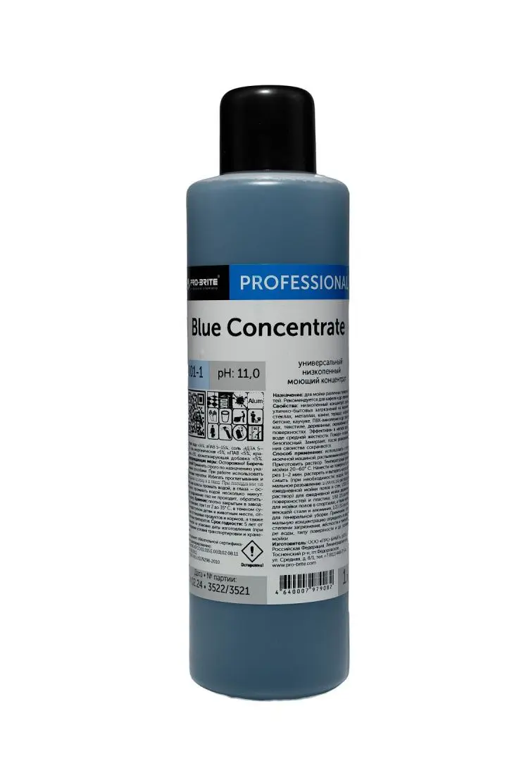 Жидкий низкопенный концентрат, прозрачный синего цвета с ароматом морской свежести. Эффективен против улично-бытовых и легких жировых загрязнений на керамике, стекле, металлах, камне, терраццо, асфальте, бетоне, каучуке, ПВХ-линолеуме и других пластиках, текстиле, деревянных и окрашенных поверхностях. Работает в мягкой воде и воде средней жесткости (0–8° Ж). Не содержит щелочь. Пожаро- и взрывобезопасен. После замораживания свойства сохраняются при размораживании.