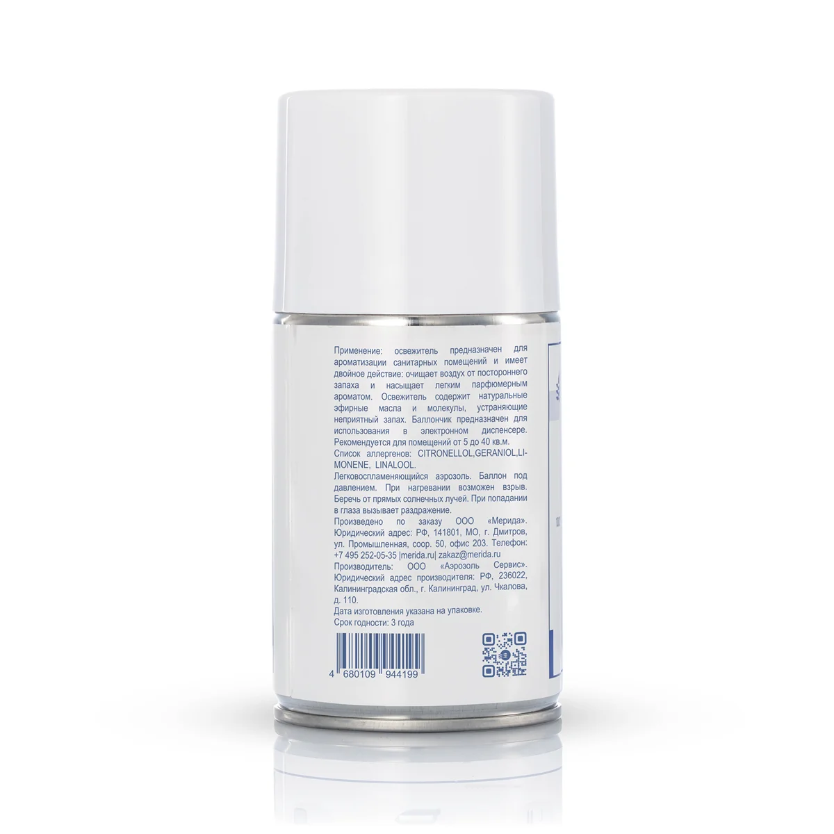 В баллоне более 3000 порций, а концентрированный состав позволяет устанавливать интервал распыления от 30 минут. 1 баллон на 3000 порций способен поддерживать свежесть и приятный аромат в помещении более 2 месяцев.